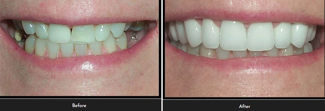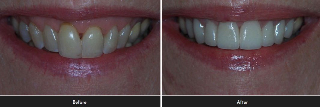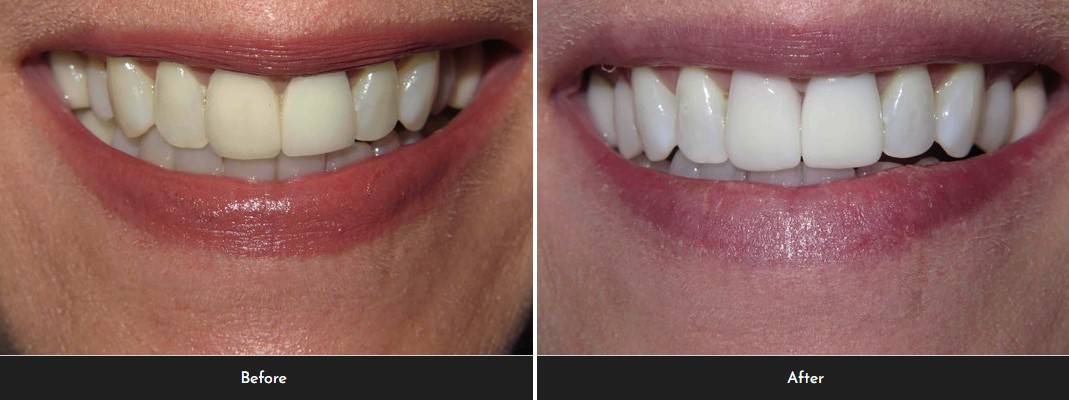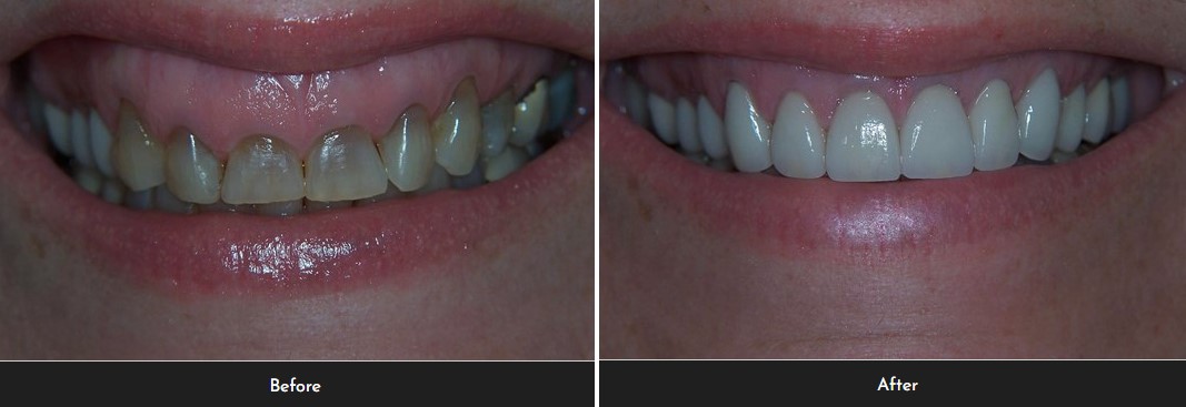 Patient unhappy with disproportionate tooth size and color from previous dental restrictions. Congenitally missing a lateral incisor. Completed treatment with anterior crowns and whitening. Patient unhappy with disproportionate tooth …